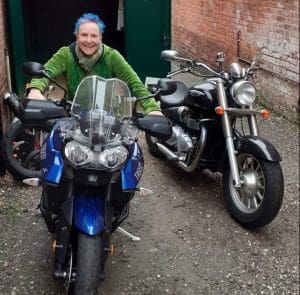 Photo shows me, Tarquin and his new stable mate Tristram. I dyed my hair to match the new ‘bike, of course.